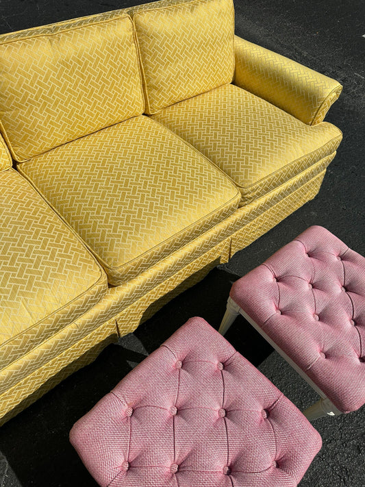 Regency Bright Yellow Fretwork Silk Upholstery Sofa Hollywood Regency Faux Bamboo