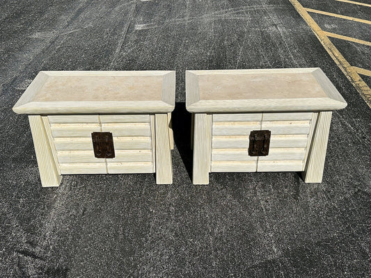 Post Modern Pair of Pencil Reed & Travertine Pagoda Side Tables