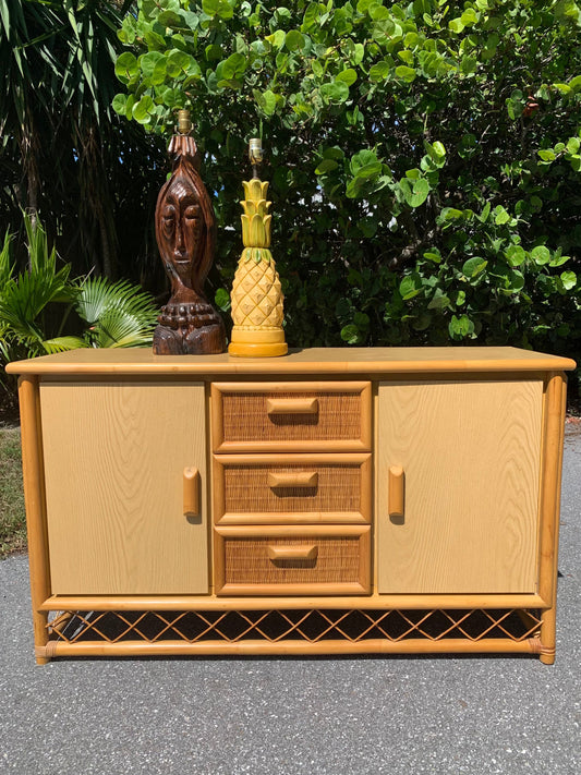 Vintage Rattan Credenza Mid Century Modern Cabinet Old Florida Palm Beach Tiki