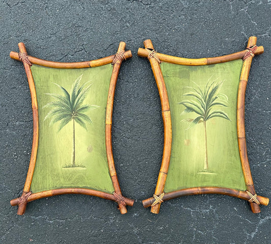 Vintage Old Florida Original Tropical Palm Tree Painting with Bamboo Frames Tiki
